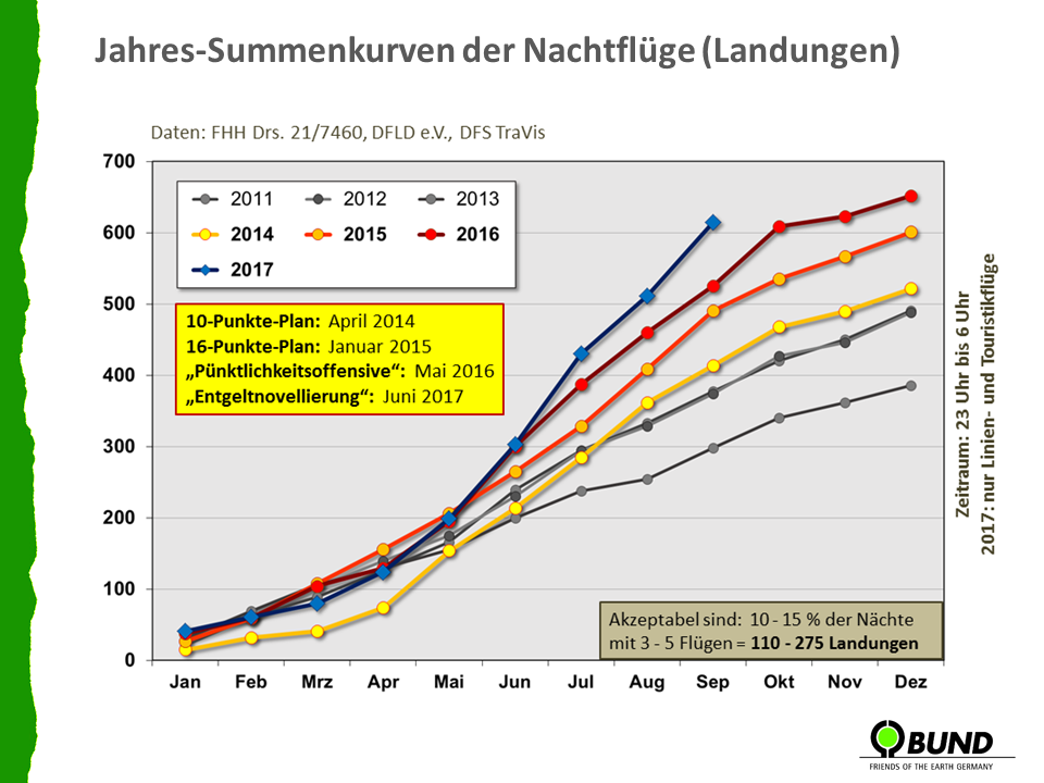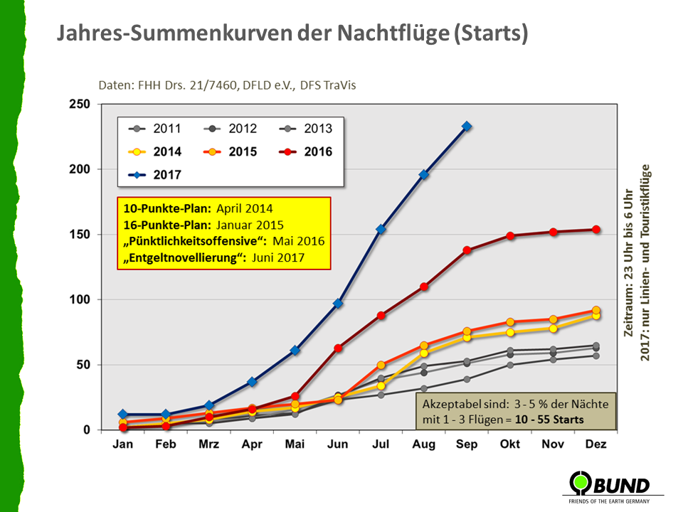 ... Für das Jahr 2017 geht der BUND bereits jetzt davon aus, dass es das lauteste Flugjahr seit der Jahrtausendwende wird. Auch die Starts und Landungen nach 23 Uhr – innerhalb der derzeitigen offiziellen Nachtflugbegrenzung – steigen im Vergleich zu den Vorjahren dramatisch an.