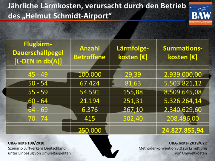 Die fluglärmbedingten immateriellen Gesundheitskosten sowie die konkreten Gesundheitsschäden für die insgesamt ca. 250.000 vom Fluglärm betroffenen Bürgerinnen und Bürger in Hamburg und Schleswig-Holstein belaufen sich auf ca. 24,8 Mio. Euro pro Jahr!
